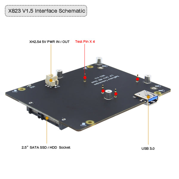 The X823 V1.5 shield added 4pcs test pins on board, which will touch with the Raspberry Pi 4 board to power each other by test pins. Just like the new X825 V2.0 version.