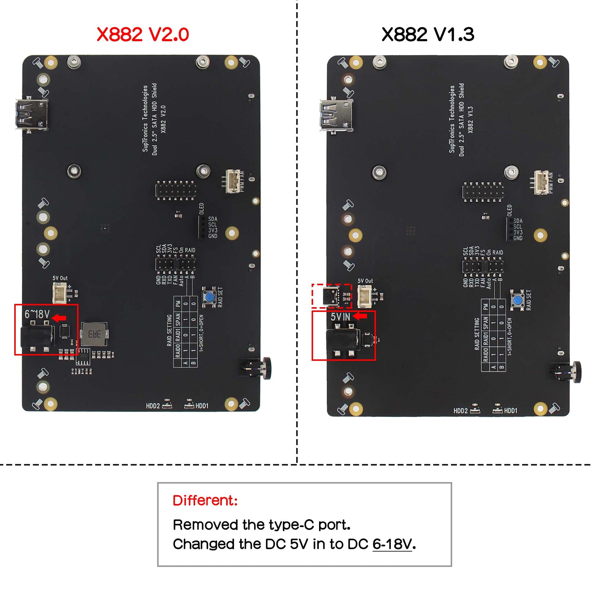 Difference of X882 V2.0 and X1.3: Change the DC Jack from 5V input to 6V-18V width voltage input.