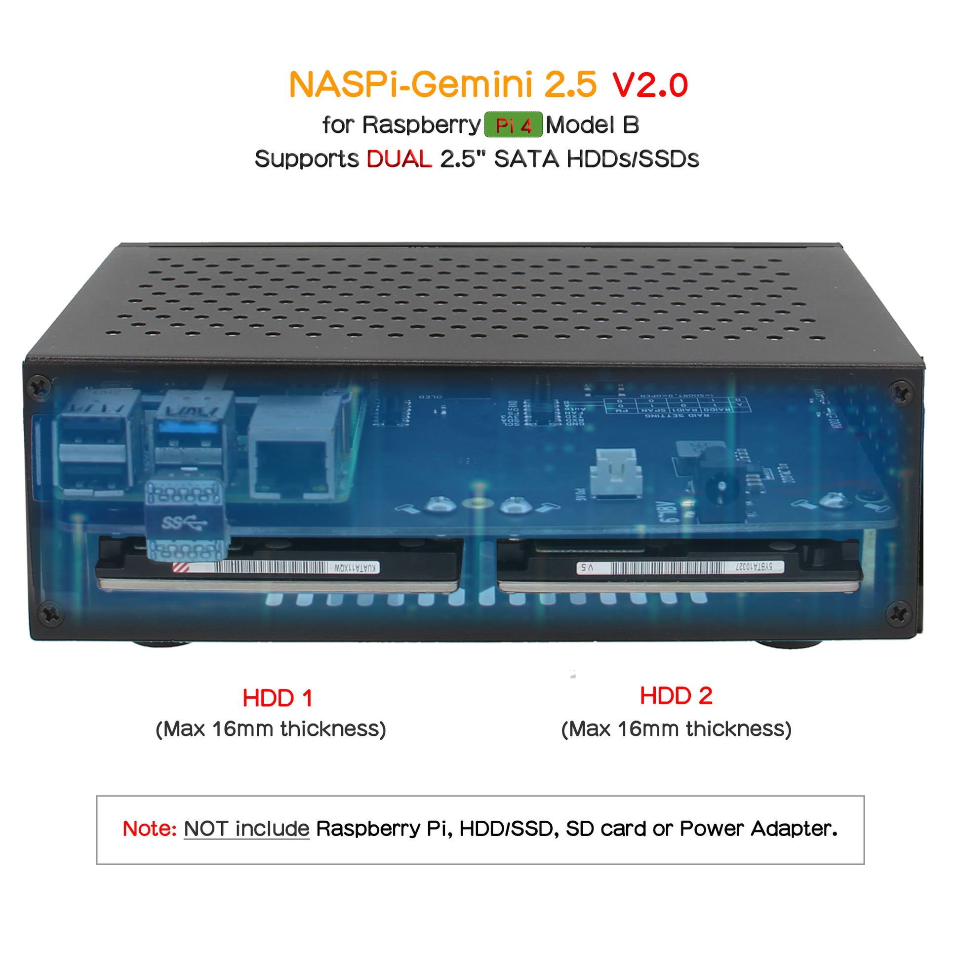 Geekworm NASPi Gemini 2.5 is an ultra-compact dual 2.5 inch SATA HDD/SSD NAS storage kit with safe shutdown, auto power on& RAID function that specially designed for Raspberry Pi 4 Model B computer, it allows two pcs 2.5" HDD/SSD to working at the same time with your Raspberry Pi 4. Also support use with one single 2.5" SATA HDD/SSD.