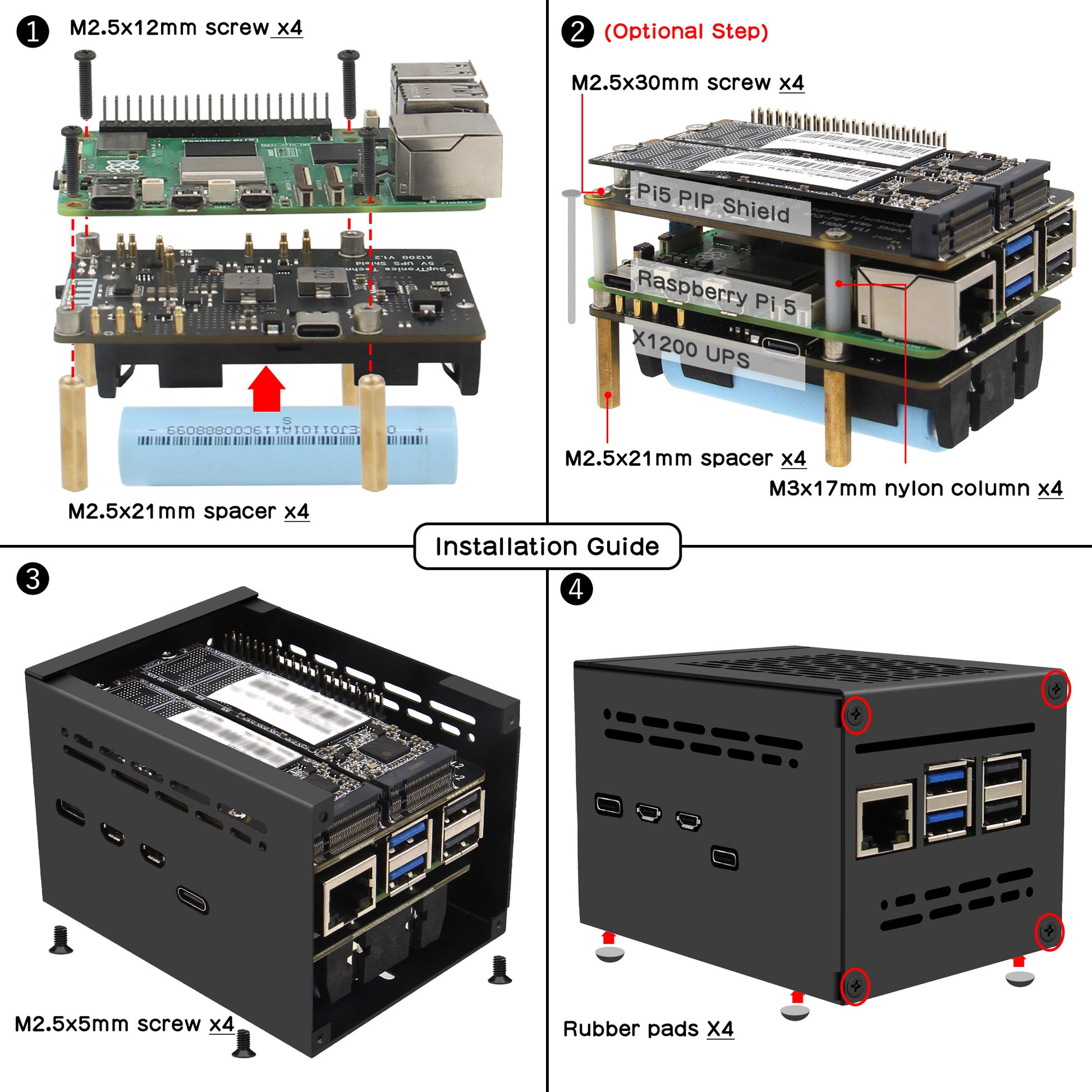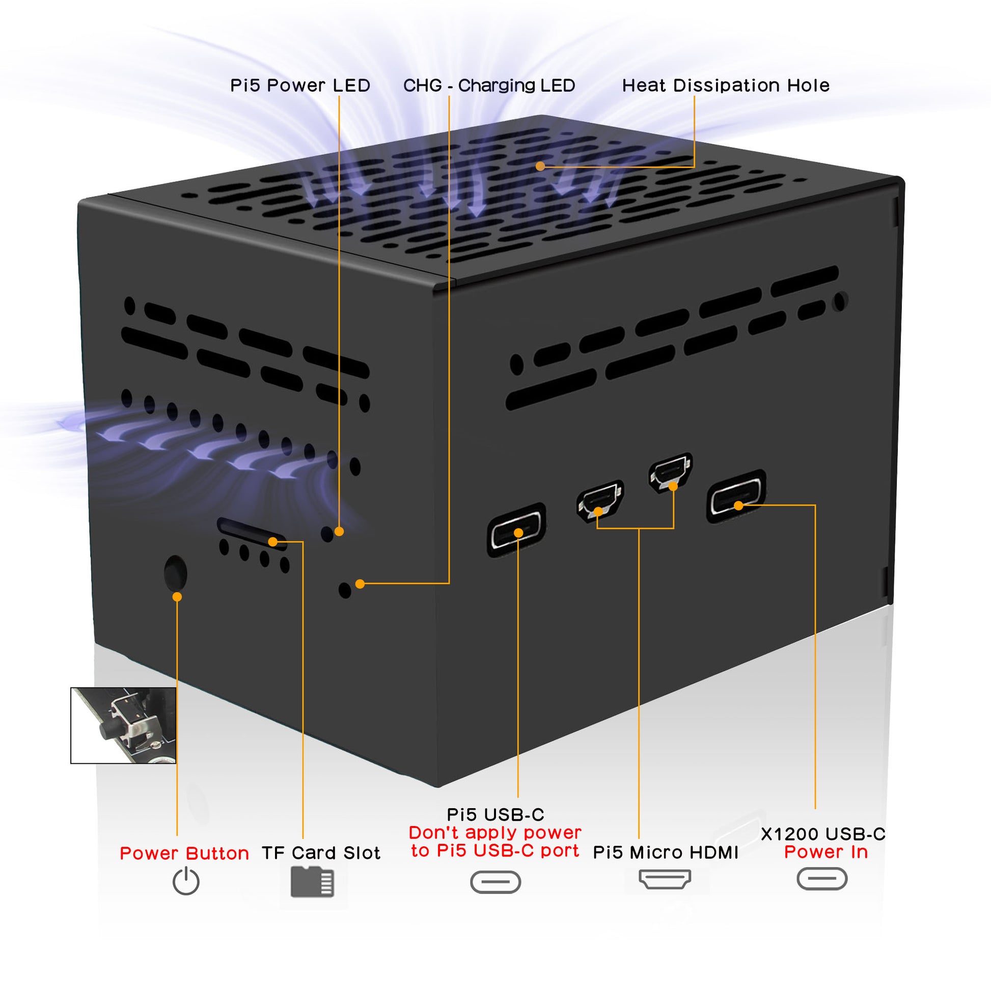 This X1200-c1 case is designed for the raspberry pi 5 X1200 ups shield only, it can fully accommodate the x1200 and the Raspberry Pi 5, with space reserved on the top for mounting the Raspberry Pi 5 Pip boards, such as the X1001, X1000, X1004, X1003 and M901.