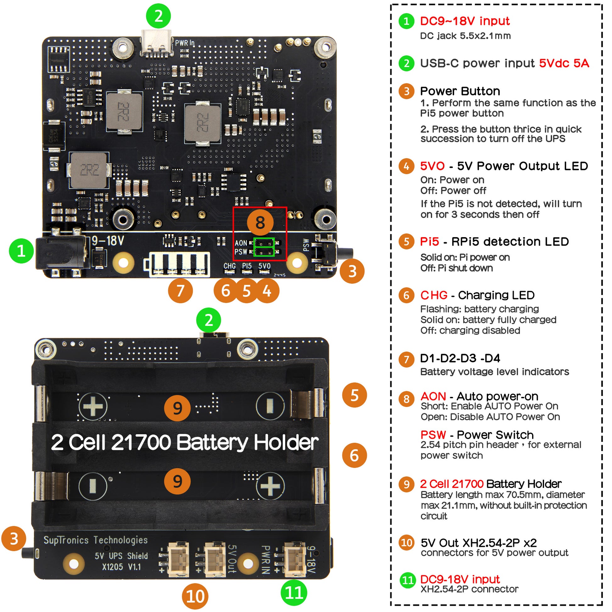 This X1205 is an ultra-compact advanced uninterruptible power supply expansion board designed specifically for the Raspberry Pi 5. It features a 2-cell Lithium 21700 battery holder, supporting up to 10,000mAh (with 2 cell 21700 batteries), With its advanced features and robust power backup capabilities, the X1205 is perfect for even the most demanding Raspberry Pi setups.