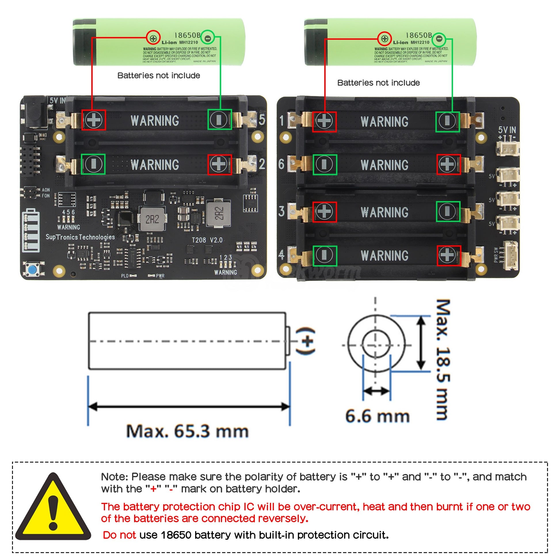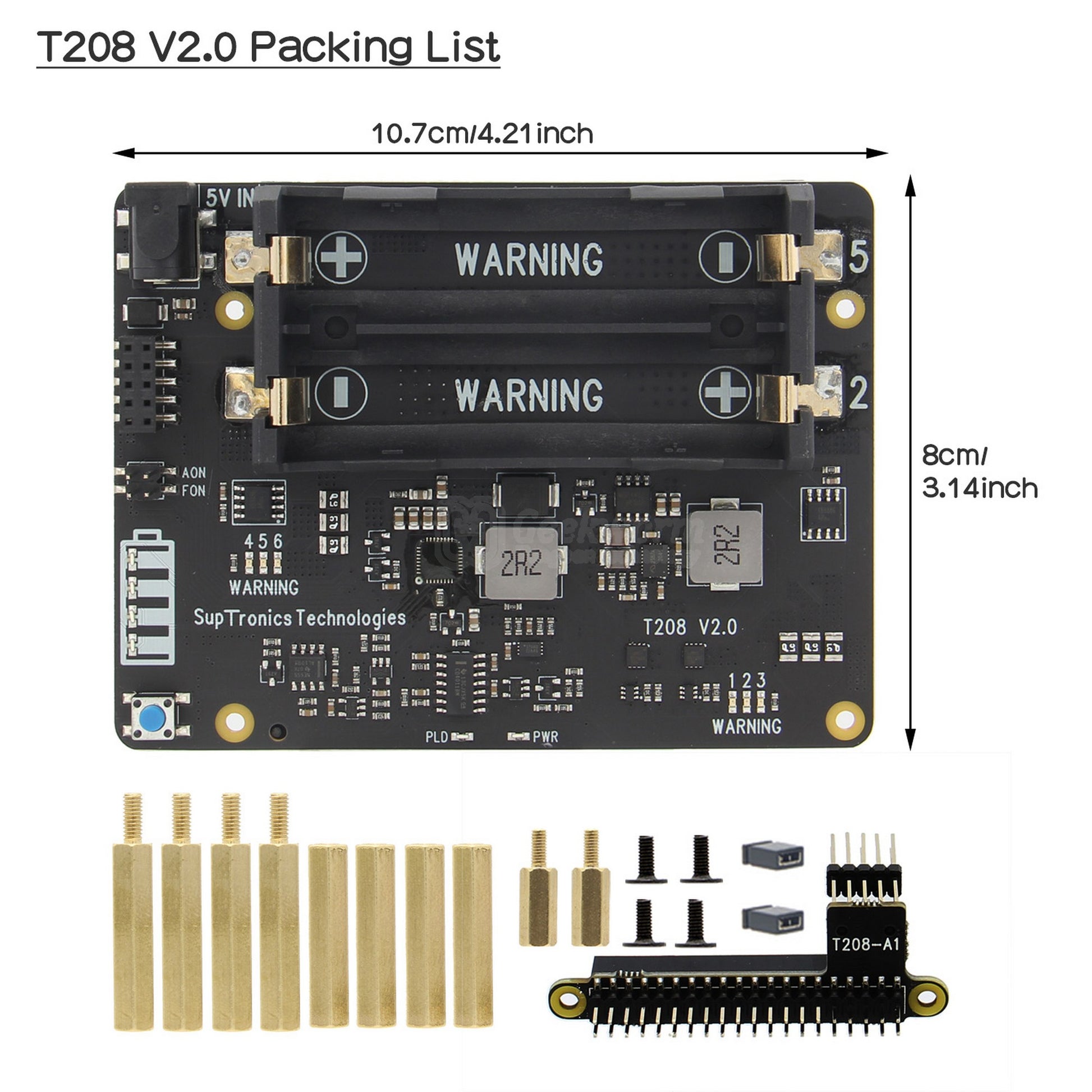 T208 is the upgrade version of T200, supports upto 6-cell 18650 battery, can provide enough power supply for your outdoor scientific research. We no longer use cable connections and use new and more reliable GPIO connections.