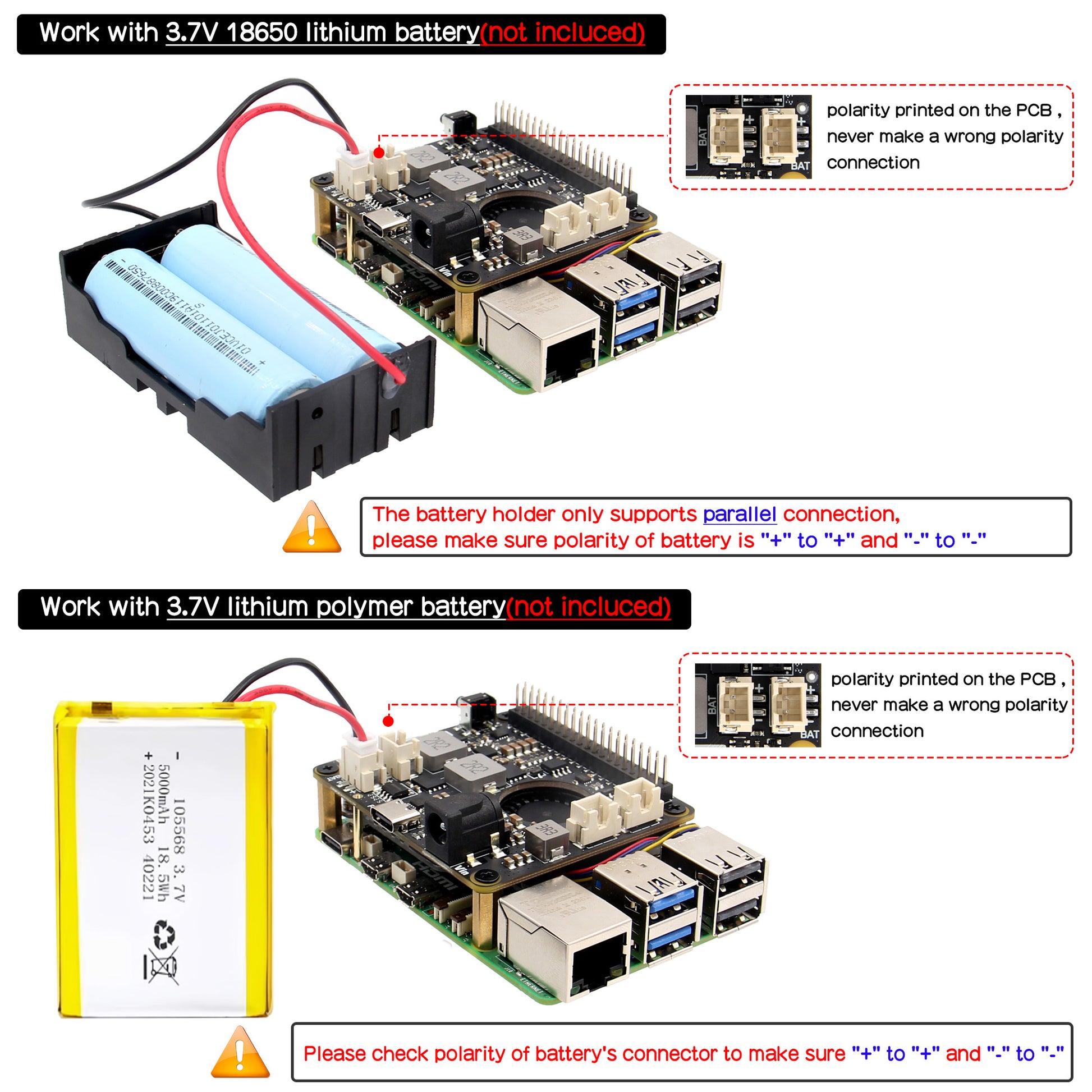 - Intelligent monitoring: All expansion boards can intelligently monitor the power status of the Raspberry Pi 5 and automatically cut off the power when shutting down, which helps to extend the battery life.